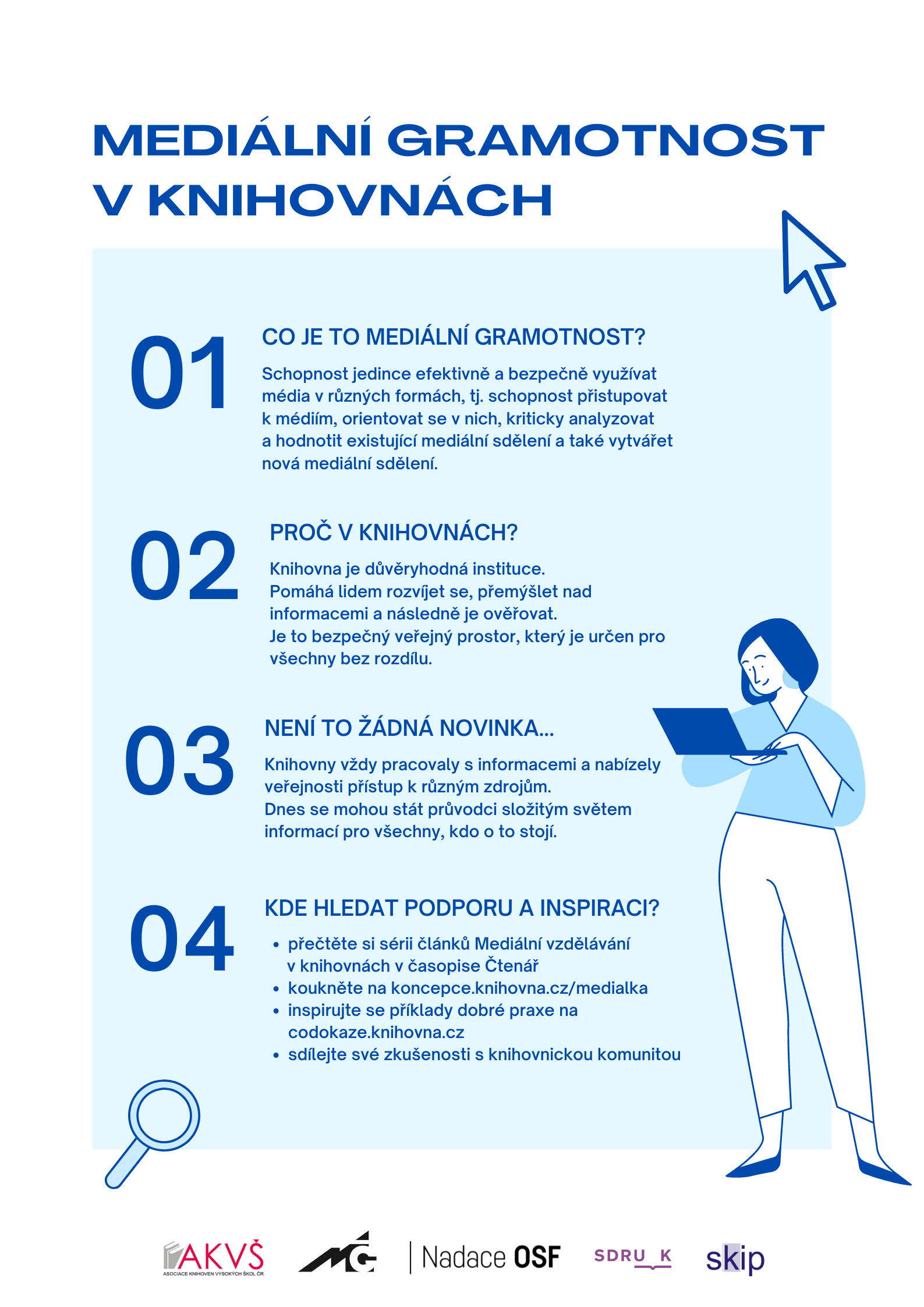 Knihovnám se už teď daří vytvářet svébytné vzdělávací a komunitní aktivity. Příklady z praxe ukazují, že oblast mediální gramotnosti nabízí celou škálu témat a přístupů, které lze rozvíjet v hravé a přátelské atmosféře, kde se lidé učí od sebe navzájem. Společné posilování mediální gramotnosti je koneckonců především cestou, jak si navzájem lépe porozumět ve světě plném rozporuplných zpráv proudících z různých informačních kanálů.